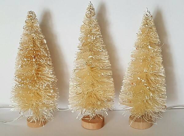 5" Ivory white miniature sisal bottle brush trees feature LED fairy lights that go all the way around the trees. Get one of each color in the set - Beautiful red, white, and blue! Features on/off switch and comes with CR2032 watch batteries!